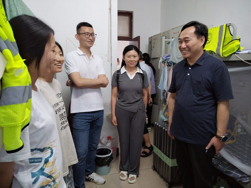 7日下午,李素矿一行刚到实习站,便前往员工宿舍看望实习员工。在员工宿舍,李素矿与同学们亲切交谈,关心了解同学们实习生活情况,交流实习体会感悟。他叮嘱同学们一定要注意安全,做好防暑降温,并勉励同学们发扬校训精神,不畏困难,认真学习,掌握扎实的专业实践本领。
