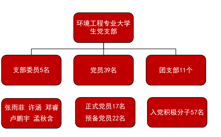beats365官方网站环境工程专业老员工党支部共有党员39名,其中正式党员17名,预备党员22名,下属团支部现有入党积极分子57名。支部书记由张雨菲同志担任,其他支部委员分别为邓睿、许涵、卢鹏宇和孟秋含。