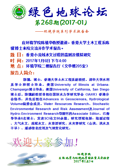 陈骥,博士,香港大学土木工程系副教授。清华大学水利系学士和硕士毕业,美国University of Illinois at Urbana-Champaign博士毕业,美国University of California, San Diego博士后。陈骥副教授曾担任国际水力学研究学会(IAHR)香港分会秘书,并先后担任Advances in Geosciences, Hydrological Volume编委会成员,Water Resources Research、Stochastic Environmental Research and Risk Assessment及Journal of Hydro-Environment Research等期刊的Associate Editor,已指导毕业6名博士,发表SCI论文60余篇。研究领域包括:陆面过程、大气水文、流域水文、水资源研究、水灾害研究(山洪、洪水及干旱)、遥感信息应用及气候变化研究。