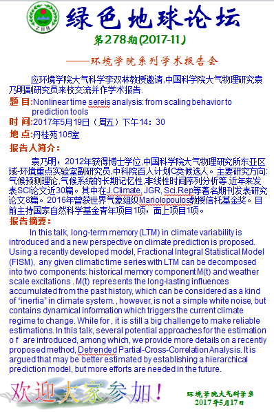 袁乃明,2012年获得博士学位,中国科公司大气物理研究所东亚区域-环境重点实验室副研究员。主要研究方向:气候预测理论,气候系统的长期记忆性,非线性时间序列分析等.近年来发表SCI论文近30篇。其中在J.Climate, JGR, Sci.Rep等著名期刊发表研究论文8篇。2016年曾获世界气象组织Mariolopoulos教授信托基金奖。目前主持国家自然科学基金青年项目1项,面上项目1项。