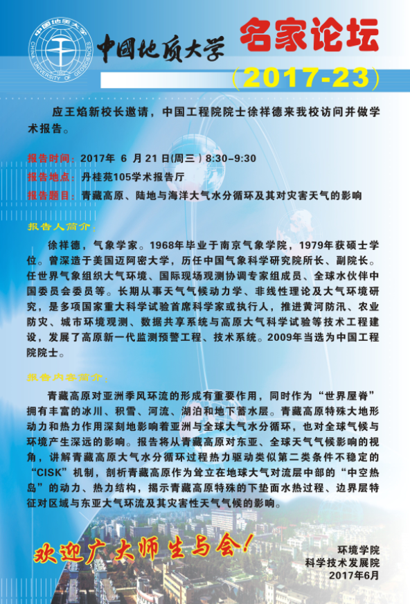 题目:青藏高原、陆地与海洋大气水分循环及其对灾害天气的影响 时间:2017年6月21日(周三)上午8:30-9:30 地点:东区丹桂苑105报告厅