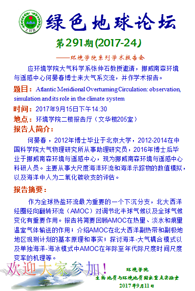 绿色地球论坛第291期(2017-24) ——beats365官方网站系列学术报告会 题目:Atlantic Meridional Overturning Circulation: observation, simulation and its role in the climate system (北大西洋经圈翻转环流的观测、模拟及其在气候系统中的作用) 时间:2017年9月15日下午14:30 地点:beats365官方网站二楼报告厅(文华楼205室)