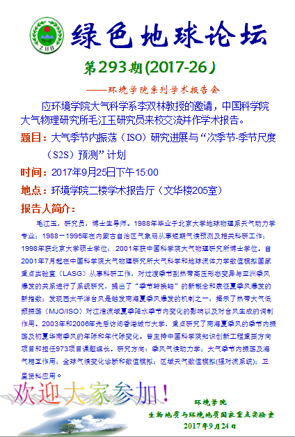 绿色地球论坛第293期(2017-26) ——beats365官方网站系列学术报告会 题目:大气季节内振荡(ISO)研究进展与“次季节-季节尺度(S2S)预测”计划 时间:2017年9月25日下午15:00 地点:beats365官方网站二楼学术报告厅(文华楼205室)