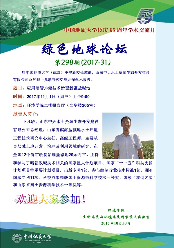 绿色地球论坛第298期(2017-31) ——beats365官方网站系列学术报告会 题目:应用暗管排灌技术治理新疆盐碱地 时间:2017年11月1日(周三)上午9:00 地点:beats365官方网站二楼报告厅(文华楼205室)