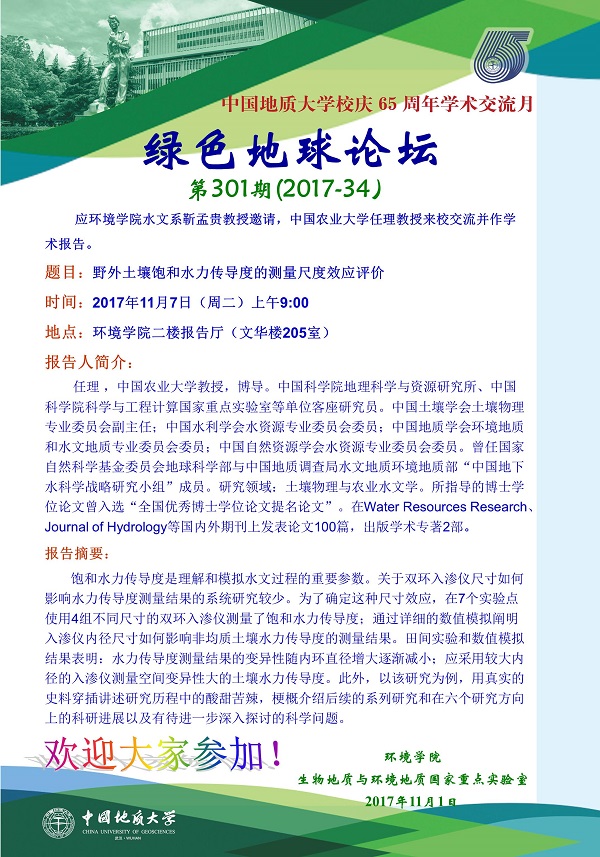 绿色地球论坛第301期(2017-34) ——beats365官方网站系列学术报告会 题目:野外土壤饱和水力传导度的测量尺度效应评价 时间:2017年11月7日(周二)上午9:00 地点:beats365官方网站二楼报告厅(文华楼205室)