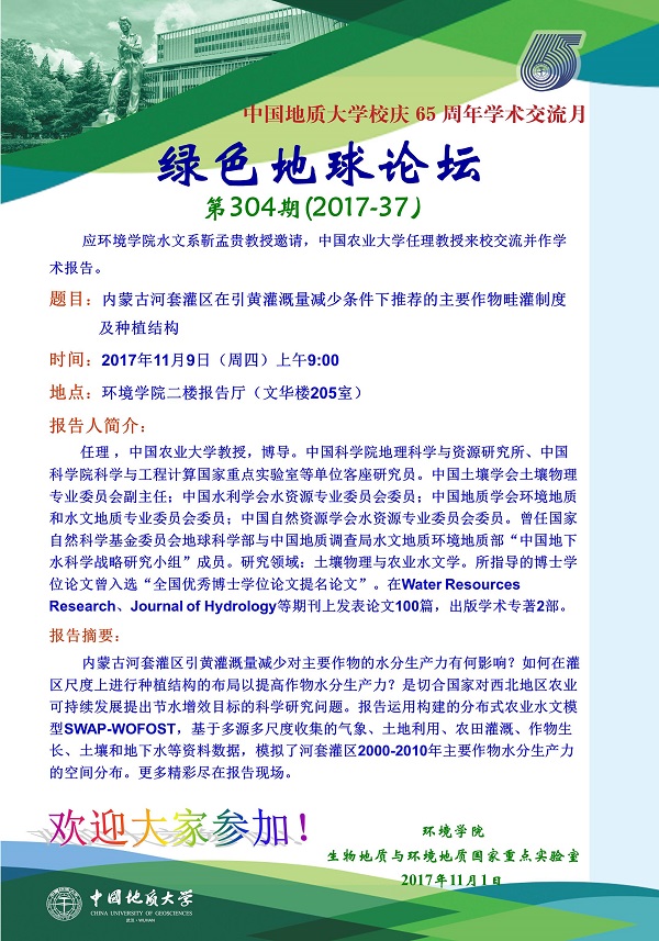 绿色地球论坛第304期(2017-37) ——beats365官方网站系列学术报告会 题目:内蒙古河套灌区在引黄灌溉量减少条件下推荐的主要作物畦灌制度及种植结构 时间:2017年11月9日(周四)上午9:00 地点:beats365官方网站二楼报告厅(文华楼205室)