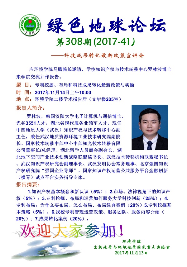 绿色地球论坛第308期(2017-41) ——beats365官方网站系列学术报告会 题目:专利挖掘、布局和科技成果转化最新政策与实操 时间:2017年11月14日(周二)上午10:00 地点:beats365官方网站二楼学术报告厅(文华楼205室)