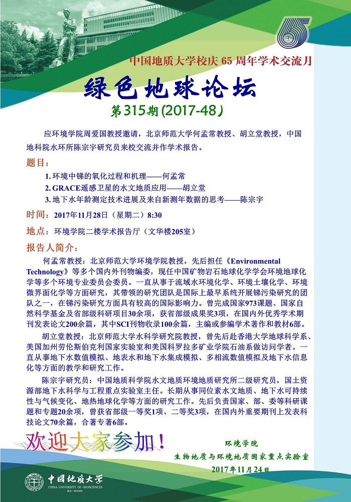 绿色地球论坛第315期(2017-48) beats365官方网站“校庆65周年学术交流月”——高知论坛 题目: 1. 环境中锑的氧化过程和机理——何孟常 2. GRACE遥感卫星的水文地质应用——胡立堂 3. 地下水年龄测定技术进展及来自新测年数据的思考——陈宗宇 时间:2017年11月28日(周二)上午8:30 地点:beats365官方网站二楼学术报告厅(文华楼205室)