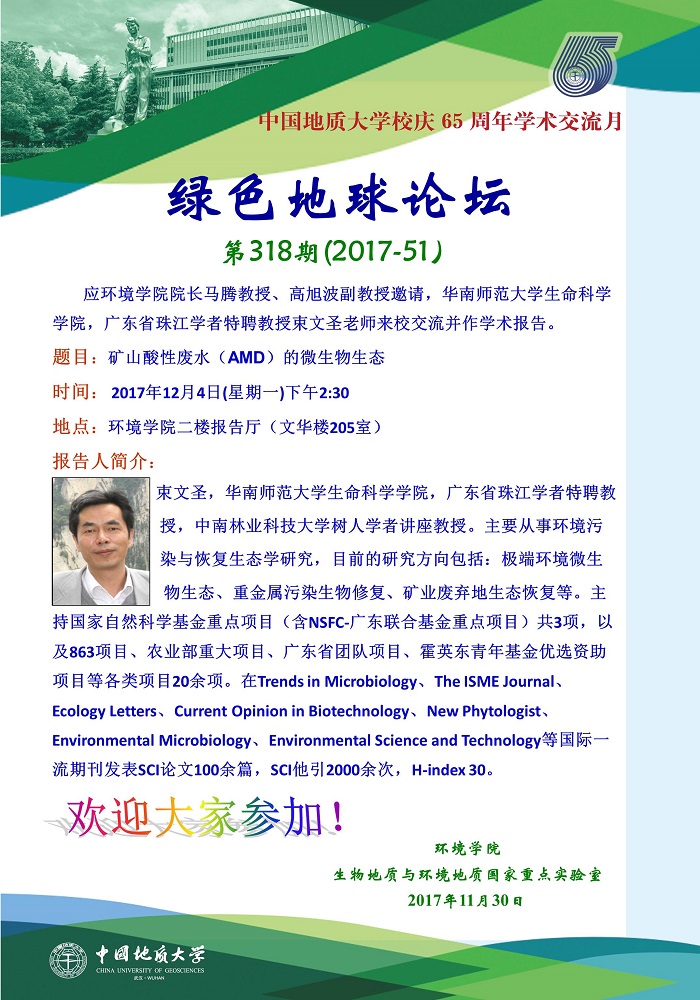 绿色地球论坛第318期(2017-51) beats365官方网站“校庆65周年学术交流月”——高知论坛 题目:矿山酸性废水(AMD)的微生物生态 时间:2017年12月4日(周一)下午14:30 地点:beats365官方网站二楼学术报告厅(文华楼205室)