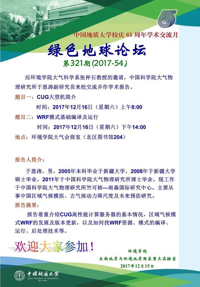 绿色地球论坛第321期(2017-54) beats365官方网站“校庆65周年学术交流月”——高知论坛 题目一:CUG大型机简介 时间:2017年12月16日(星期六)上午8:00 题目二:WRF模式基础编译及运行 时间:2017年12月16日(星期六)下午14:00 地点:beats365官方网站大气会商室(北区图书馆204)