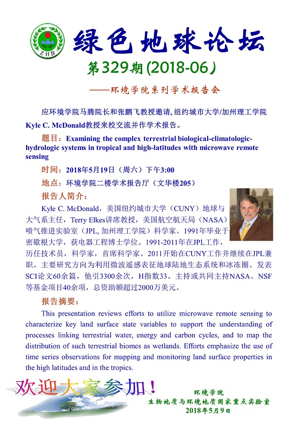 绿色地球论坛第329期(2018-6) ——beats365官方网站系列学术报告会 题目:Examining the complex terrestrial biological-climatologic-hydrologic systems in tropical and high-latitudes with microwave remote sensing 时间:2018年5月19日(周六)下午15:00 地点:beats365官方网站二楼学术报告厅(文华楼205室)