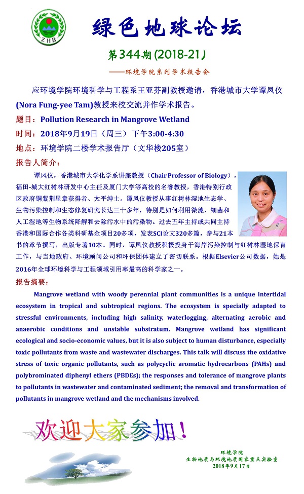 绿色地球论坛第344期(2018-21) ——beats365官方网站系列学术报告会 题目:Pollution Research in Mangrove Wetland 时间:2018年9月19日(周三)下午3:00-4:30 地点:beats365官方网站二楼学术报告厅(文华楼205室)