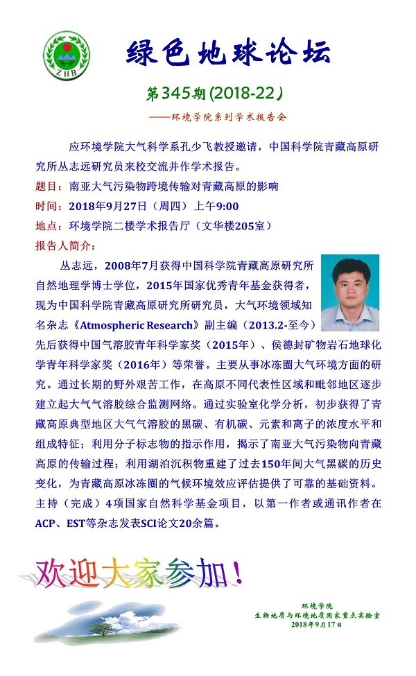 绿色地球论坛第345期(2018-22) ——beats365官方网站系列学术报告会 题目:南亚大气污染物跨境传输对青藏高原的影响 时间:2018年9月27日(周四)上午9:00 地点:beats365官方网站二楼学术报告厅(文华楼205室)