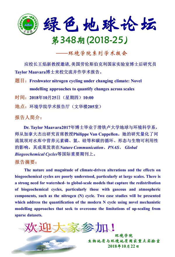 绿色地球论坛第348期(2018-25) ——beats365官方网站系列学术报告会 题目:Freshwater nitrogen cycling under changing climate: Novel modelling approaches to quantify changes across scales 时间:2018年10月25日(周四)上午10:00 地点:beats365官方网站学术报告厅(文华楼205室)