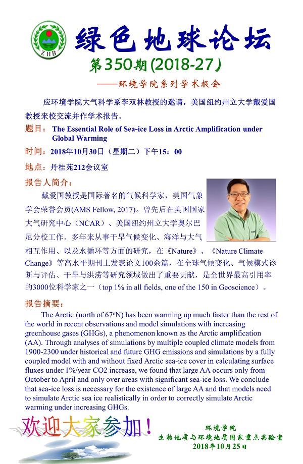 绿色地球论坛第350期(2018-27) ——beats365官方网站系列学术报告会 题目:The Essential Role of Sea-ice Loss in Arctic Amplification under Global Warming 时间:2018年10月30日(周二)下午15:00 地点:丹桂苑212室