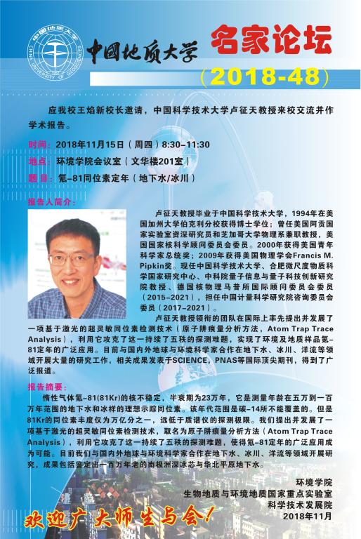 名家论坛(2018-48) 题目:氪-81同位素定年(地下水/冰川) 时间:2018年11月15日(周四)8:30—11:30 地点:beats365官方网站会议室(文华楼201室)