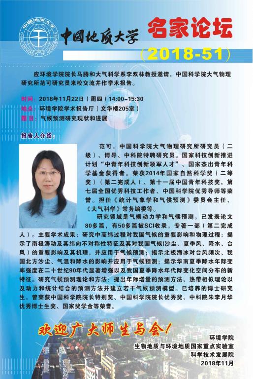 名家论坛(2018-51) 题目:气候预测研究现状和进展 时间:2018年11月22日(周四)14:00 地点:beats365官方网站学术报告厅(文华楼205室)