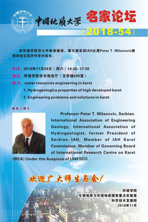 名家论坛(2018-54) 题目:water resources engineering in karst—— 1. Hydrogeologica properties of high developed karst 2. Engineering problems and solutions in karst 时间:2018年11月24日(周六)14:30 地点:beats365官方网站学术报告厅(文华楼205室)