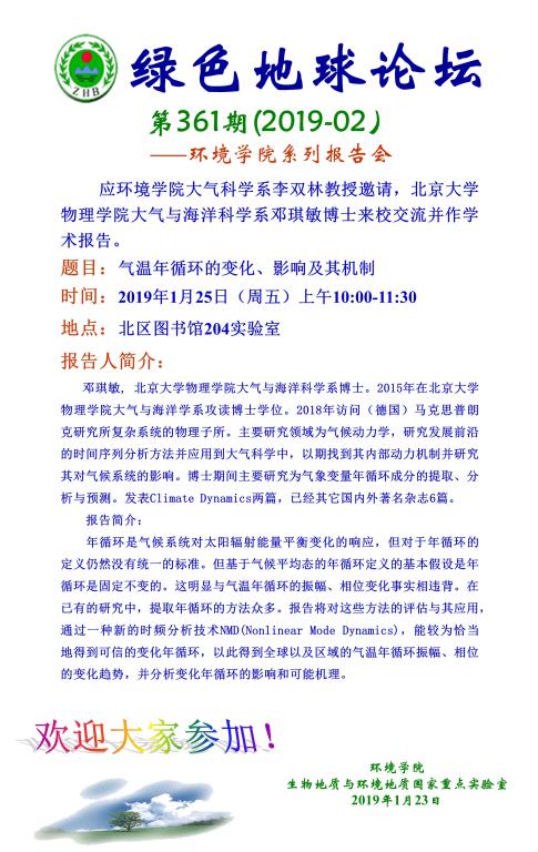 绿色地球论坛第361期(2019-02) ——beats365官方网站系列学术报告会 题目:气温年循环的变化、影响及其机制 时间:2019年1月25日(周五)10:00—11:30 地点:北区图书馆204实验室