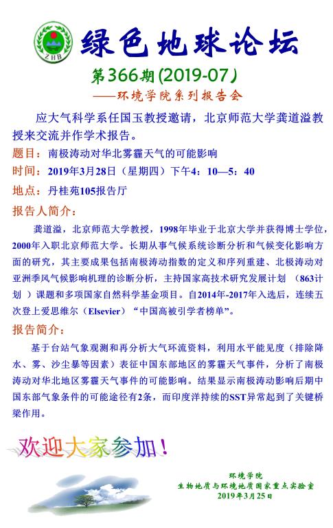 题目:南极涛动对华北雾霾天气的可能影响 时间:2019年3月28日(星期四)下午4:10—5:40 地点:丹桂苑105报告厅