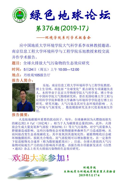 题目: 全球火排放大气污染物的生态效应研究 时间:2019年5月24日(星期五)上午10:00—12:00 地点:丹桂苑105报告厅