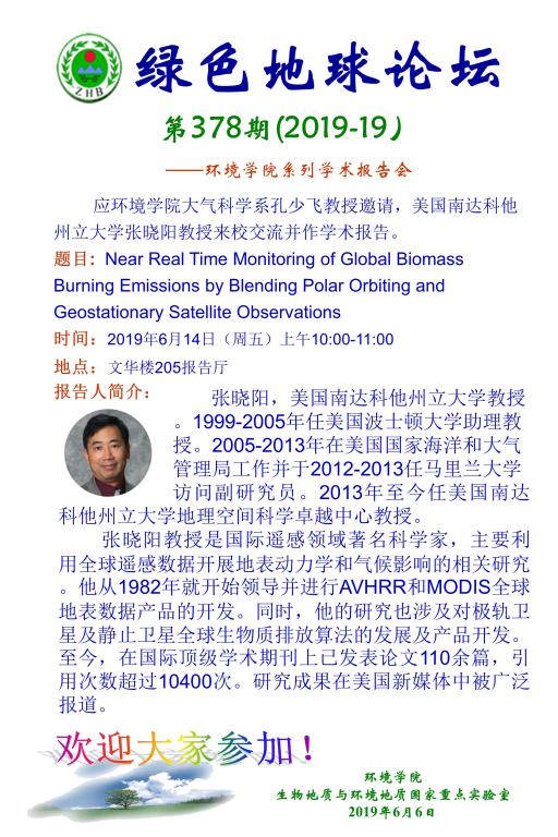 题目: Near Real Time Monitoring of Global Biomass Burning Emissions by Blending Polar Orbiting and 时间:2019年6月14日(星期五)上午10:00—11:00 地点:文华楼205报告厅