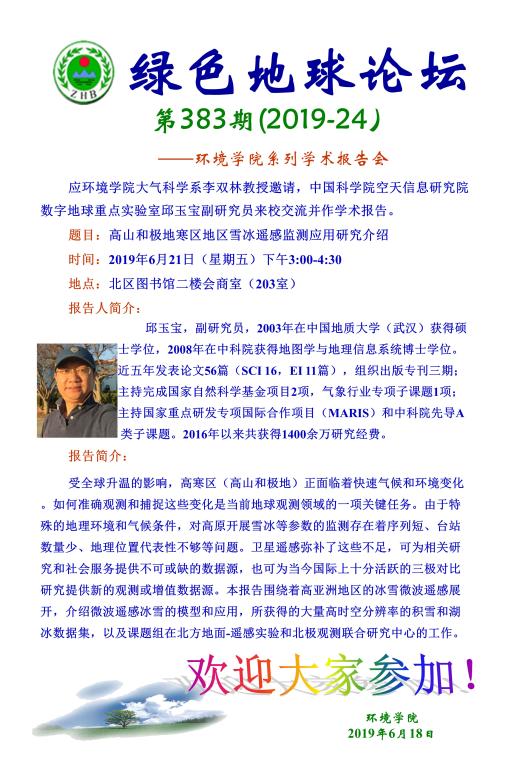 题目:高山和极地寒区地区雪冰遥感监测应用研究介绍 时间:2019年6月21日(星期五) 下午3:00-4:30 地点:北区图书馆二楼会商室(203室)