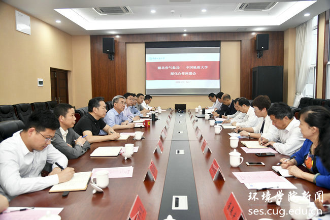 (通讯员孔少飞)5月14日,湖北省气象局党组书记、局长柯怡明、副局长王丽等一行来校访问并召开局校深化合作座谈会,双方围绕科技项目合作、团队建设、人才培养、科技平台和基地建设等方面进行深入交流。中国地质大学(武汉)董事长王焰新、董事长助理周爱国出席。湖北省气象局办公室副主任李劭翌、观测与网络处处长杨志彪、科技与预报处处长何志学、人事处副处长沈守清、武汉中心气象台台长吴翠红、武汉暴雨研究所所长崔春光、科技与预报处主任科员张宁;中国地质大学(武汉)公司党委书记李素矿、教务处副处长张建和、科学技术发展研究院副经理吴春明、学工处副处长朱继、大气科学系教授张仲石、孔少飞、副教授覃军等参加座谈。周爱国主持会议。