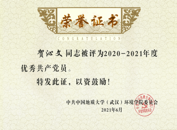 按照专业设置党支部,把支部建在专业上。贺沁文担任地下水专业老员工党支部书记,积极组织党支部开展各类政治理论学习与实践,参与公司“张国旗班”行动计划,2021年地下水专业老员工党支部被评为公司年度先进基层党组织,贺沁文被评为优秀共产党员。2018级中加班坚持思想引领,以党建带动团建,班团一体共奋进。团支部连续两年获得“校级五四红旗团支部”荣誉称号。