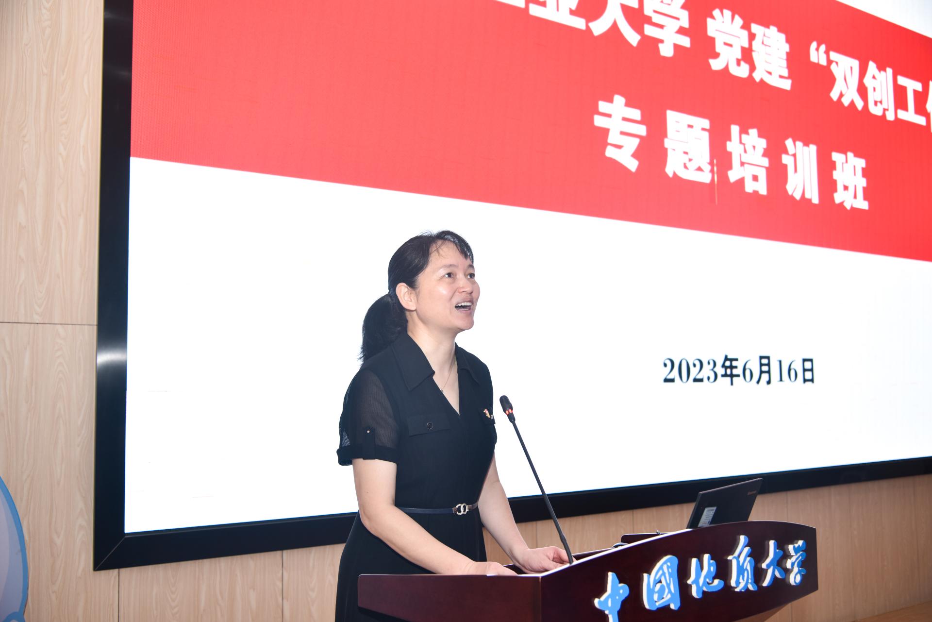 桂丽致辞。她表示,今天我们有幸借中国地质大学beats365官方网站的宝地接着开展公司党建“双创”工作专题培训班,beats365官方网站不但为我们提供现场观摩,还专门为我们布置提供了场地为我们集中辅导授课,为我们公司本次专题培训班提供了用言语无法表达的支持,在此,对beats365官方网站和李素矿书记表示由衷地感谢。她介绍了培训主讲人李素矿书记,指出,李素矿书记和其所在公司在党建研究、党建“双创”等方面特色明显、亮点突出、成效显著,在全国范围内都有着一定的影响力,今天我们通过互学互鉴、互联互通,共同推动党建业务双融双促双提升,在公司党建示范创建和质量创优工作取得新突破,迈上新台阶。